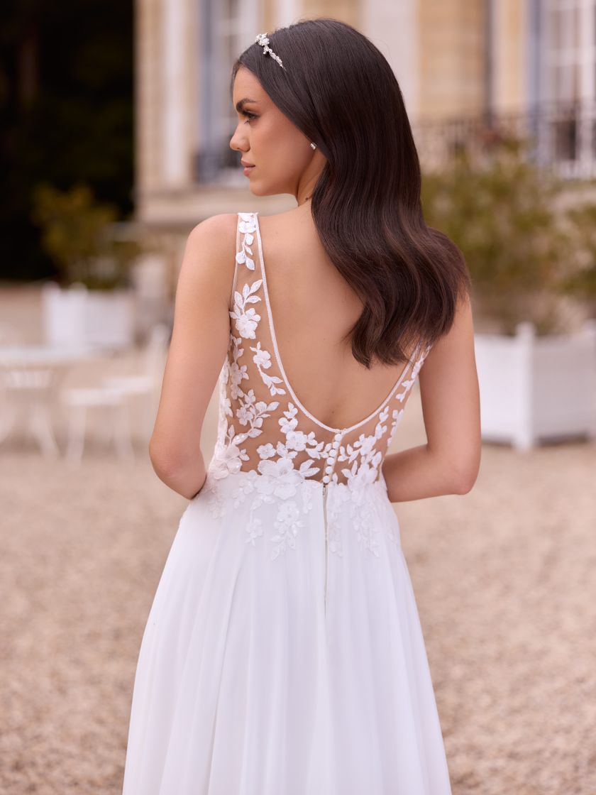 Modern, klar, selbstbewusst: Dieses bodenlange Boho-A-Linien-Brautkleid aus feiner Baumwollspitze mit floralem Muster und fließendem Chiffon betont eine natürliche Taille und setzt mit rundem Illusion-Rücken ein zartes Statement. Der feminine V-Ausschnitt und die elegante Schleppe verleihen dem Design eine harmonische Leichtigkeit. Der Rücken schließt mit einem Reißverschluss und Knöpfen. Ideal für Boho-Hochzeiten, Sommertrauungen im Freien oder romantische Gartenfeiern.