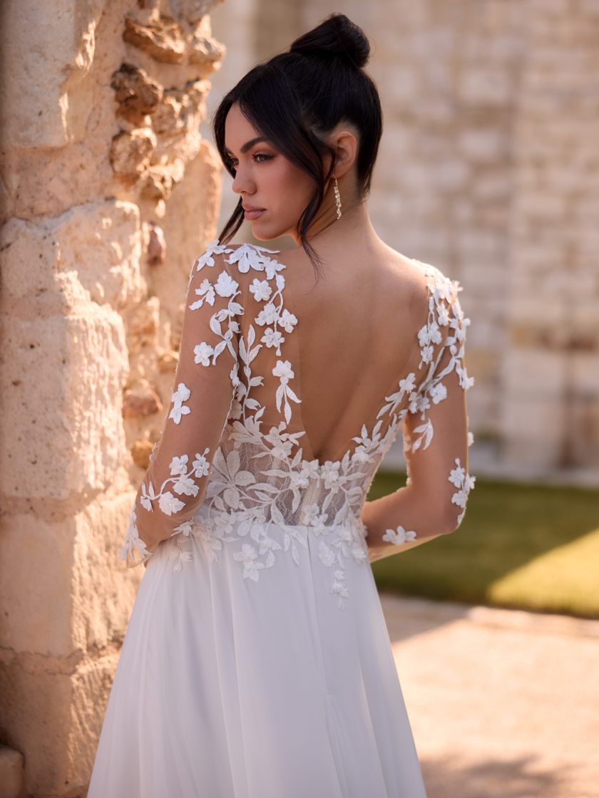 Modern, klar, selbstbewusst: Dieses bodenlange Boho-A-Linienkleid aus Chiffon und feiner Spitze betont eine natürliche Taille und setzt mit transparentem, geradem Rücken ein edles Statement. Der V-Ausschnitt und die langen Illusionsärmel verleihen dem Design feminine Eleganz. Das Oberteil mit floraler Baumwollspitze wirkt romantisch und detailreich. Eine lange Schleppe rundet den königlichen Look harmonisch ab. Der Rücken schließt mit einem Reißverschluss. Ideal für Boho-Hochzeiten, freie Trauungen oder festliche Sommerfeiern.