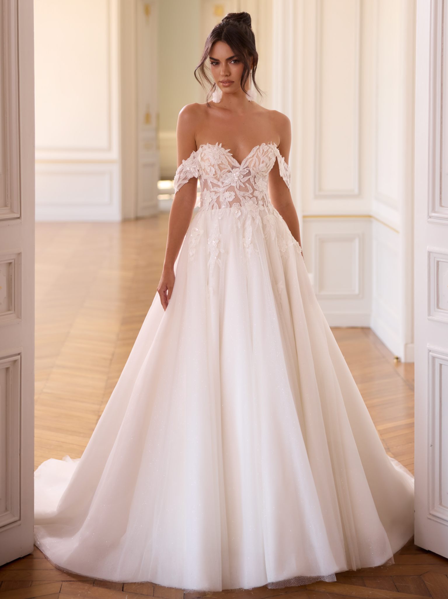 Modern, klar, selbstbewusst: Dieses bodenlange Prinzessinnen-Brautkleid aus hochwertiger Kristallspitze und glitzerndem Tüll betont eine natürliche Taille und setzt mit geradem Rücken ein elegantes Statement. Der schulterfreie Ausschnitt und das ärmellose Design schaffen eine feminine Linienführung. Die lange Schleppe sorgt für einen eindrucksvollen Auftritt. Das Oberteil ist mit floraler Kristallspitze bestickt und zeigt feine Details. Der Rücken schließt mit einem Reißverschluss, akzentuiert durch Kristallknöpfe. Ideal für klassische Zeremonien, repräsentative Empfänge oder märchenhafte Hochzeiten.