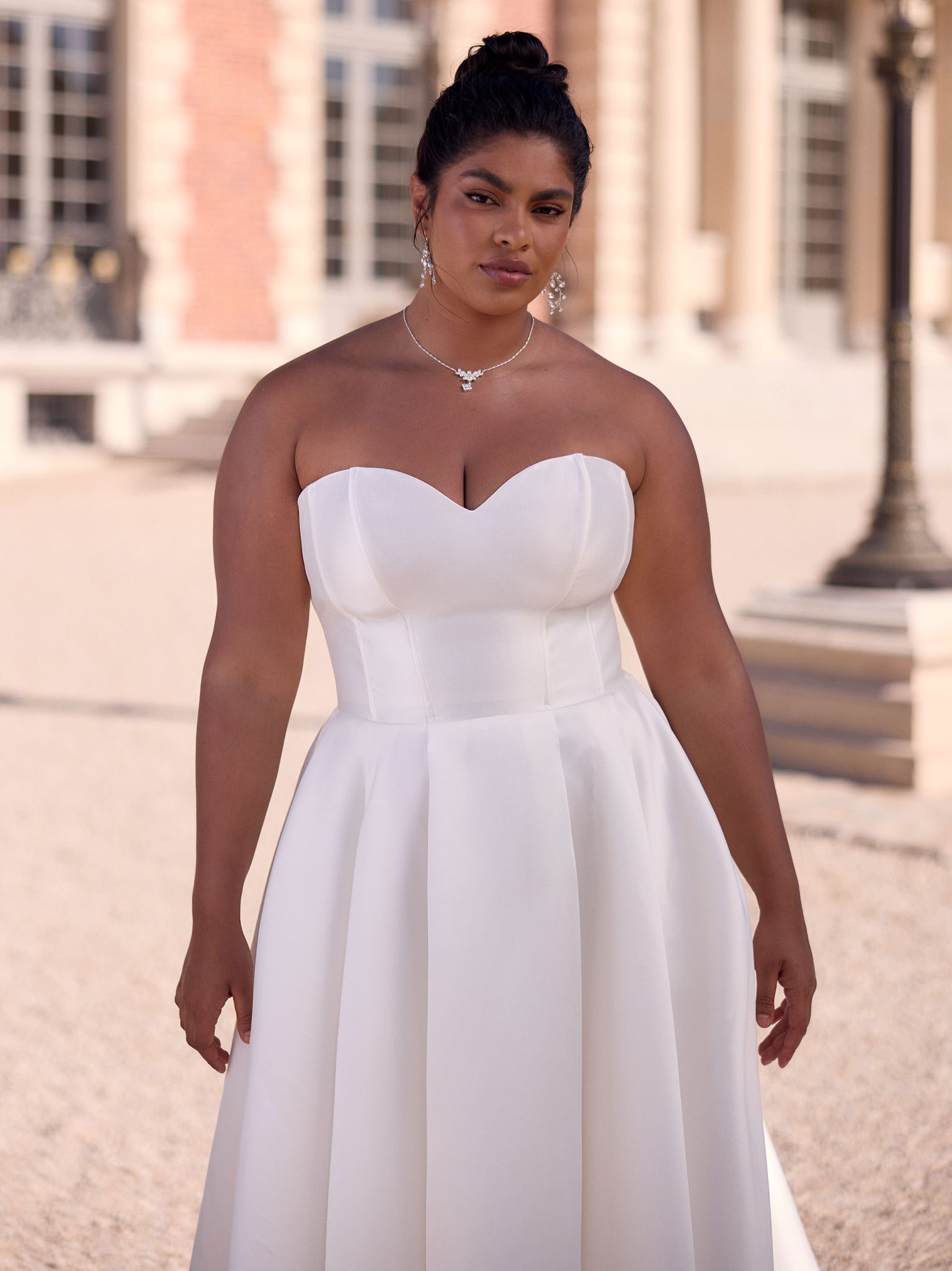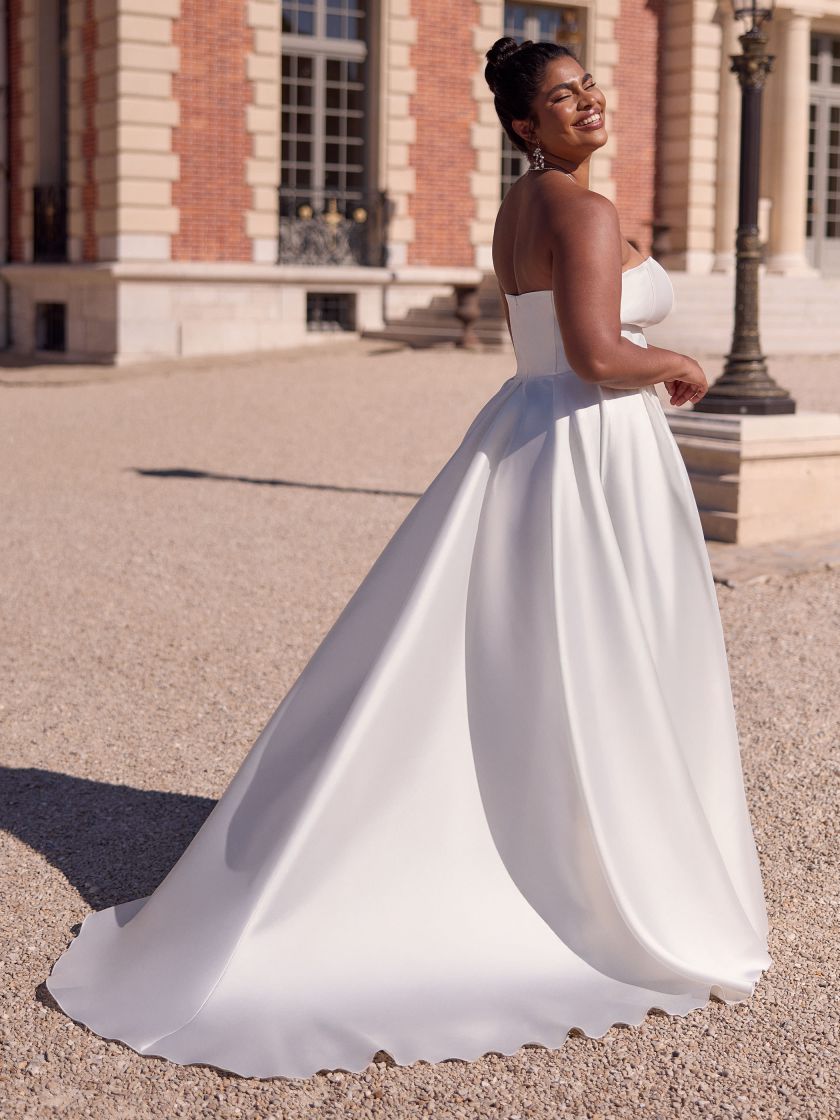 Modern, klar, selbstbewusst: Dieses bodenlange Brautkleid aus edlem Mikado betont eine natürliche Taille und setzt mit offenem Rücken ein stilvolles Statement. Der herzförmige Ausschnitt und der voluminöse Faltenrock verleihen dem Look klassische Eleganz. Der Rücken schließt mit einem Reißverschluss und feinen Knöpfen. Ideal für feierliche Trauungen, elegante Hochzeitszeremonien oder den großen Auftritt am Abend.