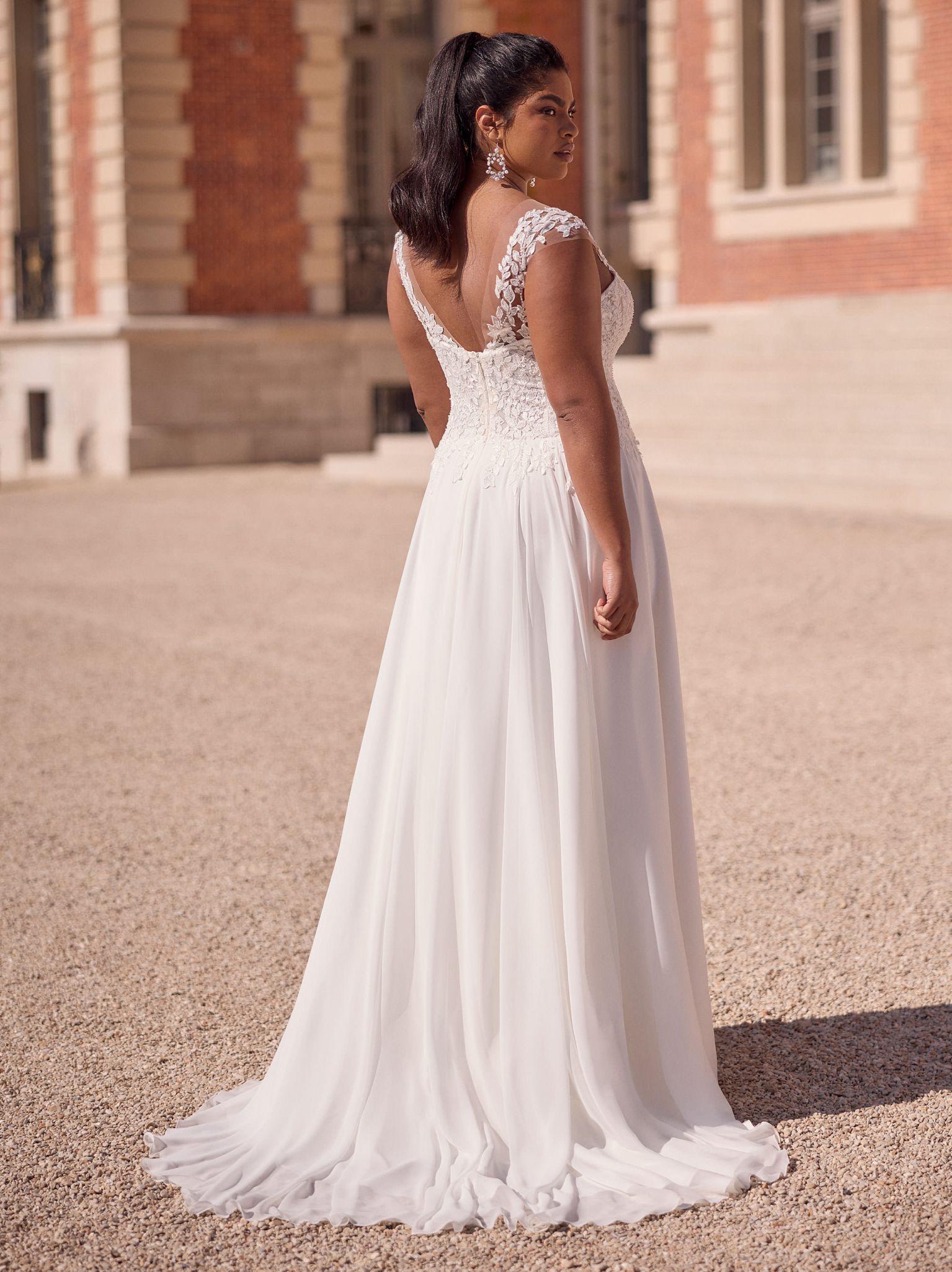 Modern, klar, selbstbewusst: Dieses bodenlange Brautkleid aus feiner Spitze und leichtem Chiffon betont eine tiefe Taille und setzt mit offenem Rücken ein romantisches Statement. Der herzförmige Ausschnitt und die zarten Schmetterlingsärmel schaffen eine feminine Silhouette. Die florale Spitzenstickerei verleiht der Korsage besondere Leichtigkeit. Der Rücken schließt mit einem Reißverschluss. Ideal für Sommerhochzeiten, romantische Landtrauungen oder feierliche Hochzeitszeremonien.