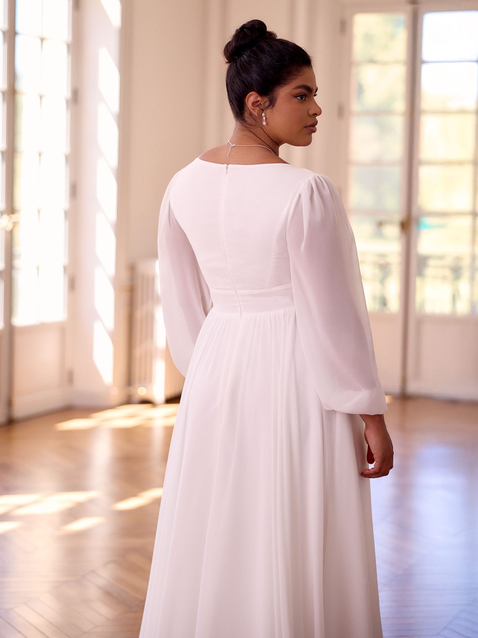 Modern, klar, selbstbewusst: Dieses bodenlange A-Linien-Brautkleid aus feinem Chiffon betont eine natürliche Taille und setzt mit bedecktem Rücken ein edles Statement. Der V-Ausschnitt und die fließenden Bischofsärmel mit Gummizug verleihen dem Look königliche Eleganz. Der vordere Schlitz sorgt für eine moderne Note. Der Rücken schließt mit einem Reißverschluss. Ideal für elegante Trauungen, Boho-Hochzeiten oder festliche Feiern.